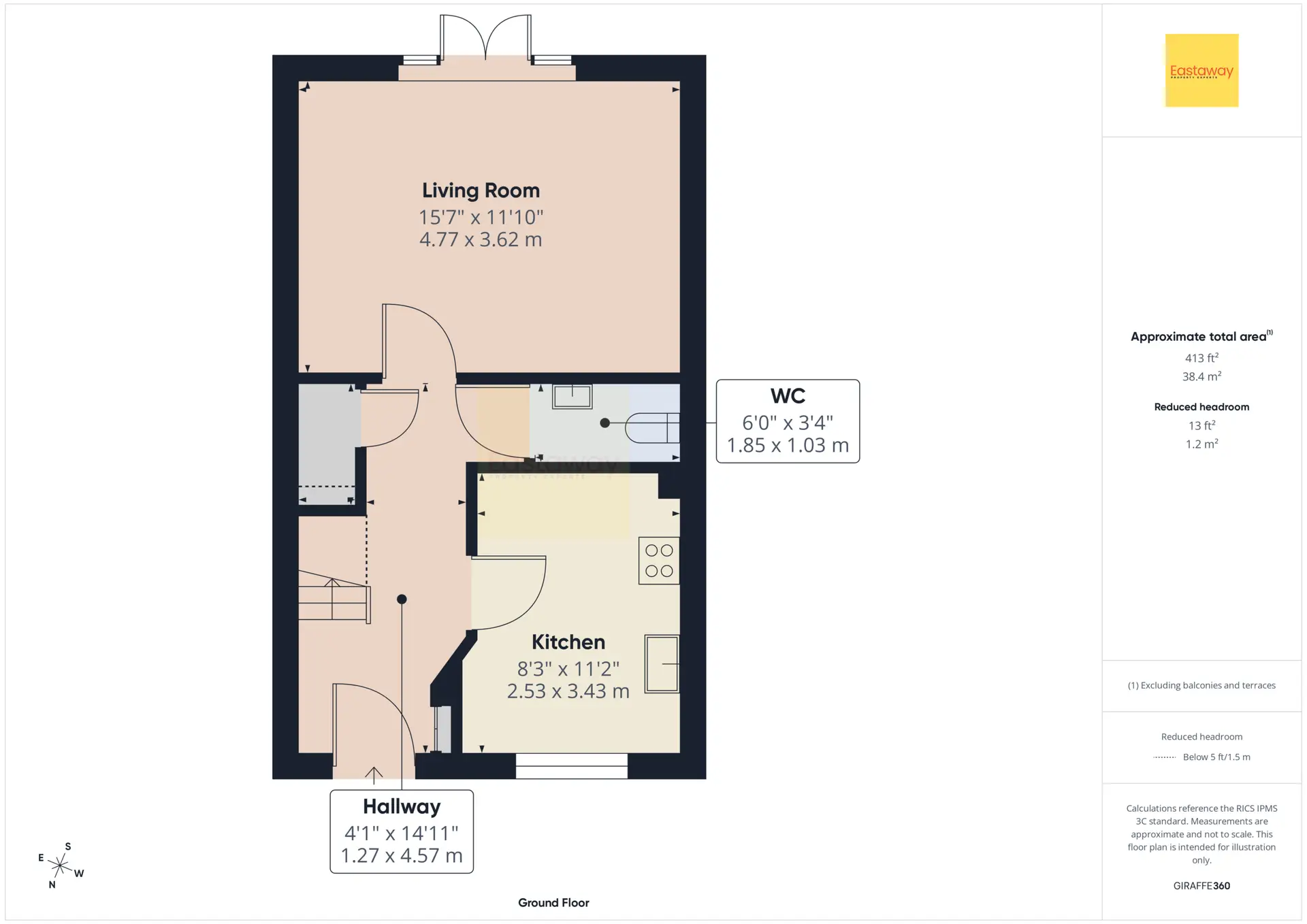 Ground Floor WC 6' 1" x 3' 5" (1.85m x 1.03m)