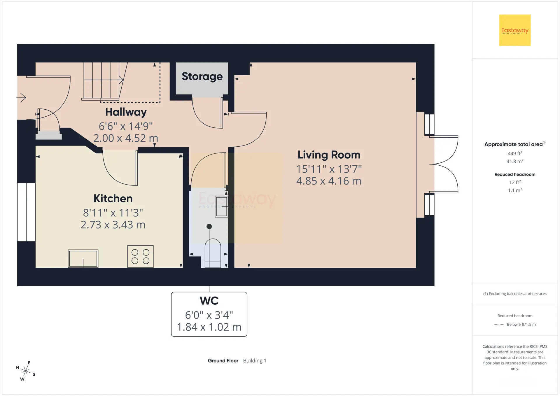 Ground Floor WC 6' 0" x 3' 4" (1.84m x 1.02m)