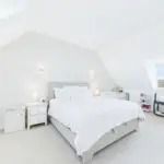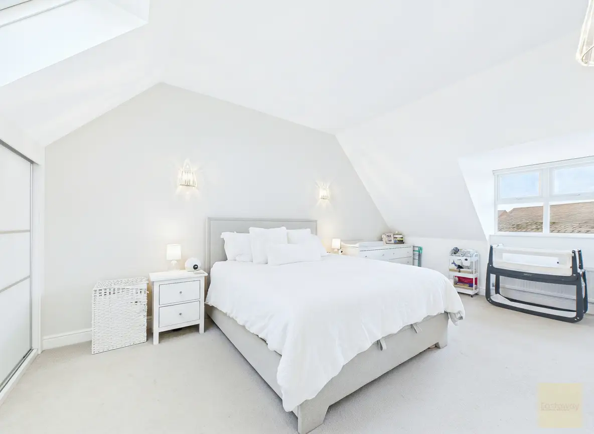The principal bedroom occupies its own level, creating a proper retreat away from the rest of the house. It’s a beautifully sized space with built in wardrobes and a sleek en suite, and it feels calm, private, and luxurious. The owners talk about winter evenings up here, moonlight coming through the Velux window, book in hand, bedside lamp on, and you can immediately picture it. It’s the kind of room that makes slow mornings and early nights feel like a daily essential rather than a rare luxury.