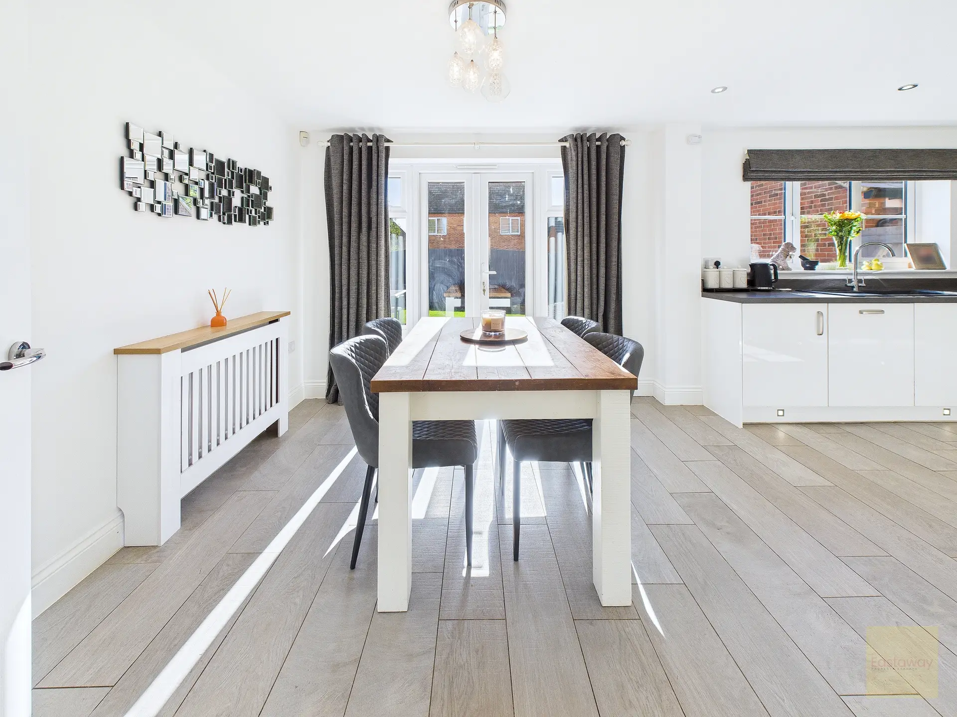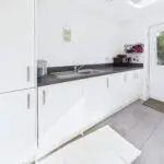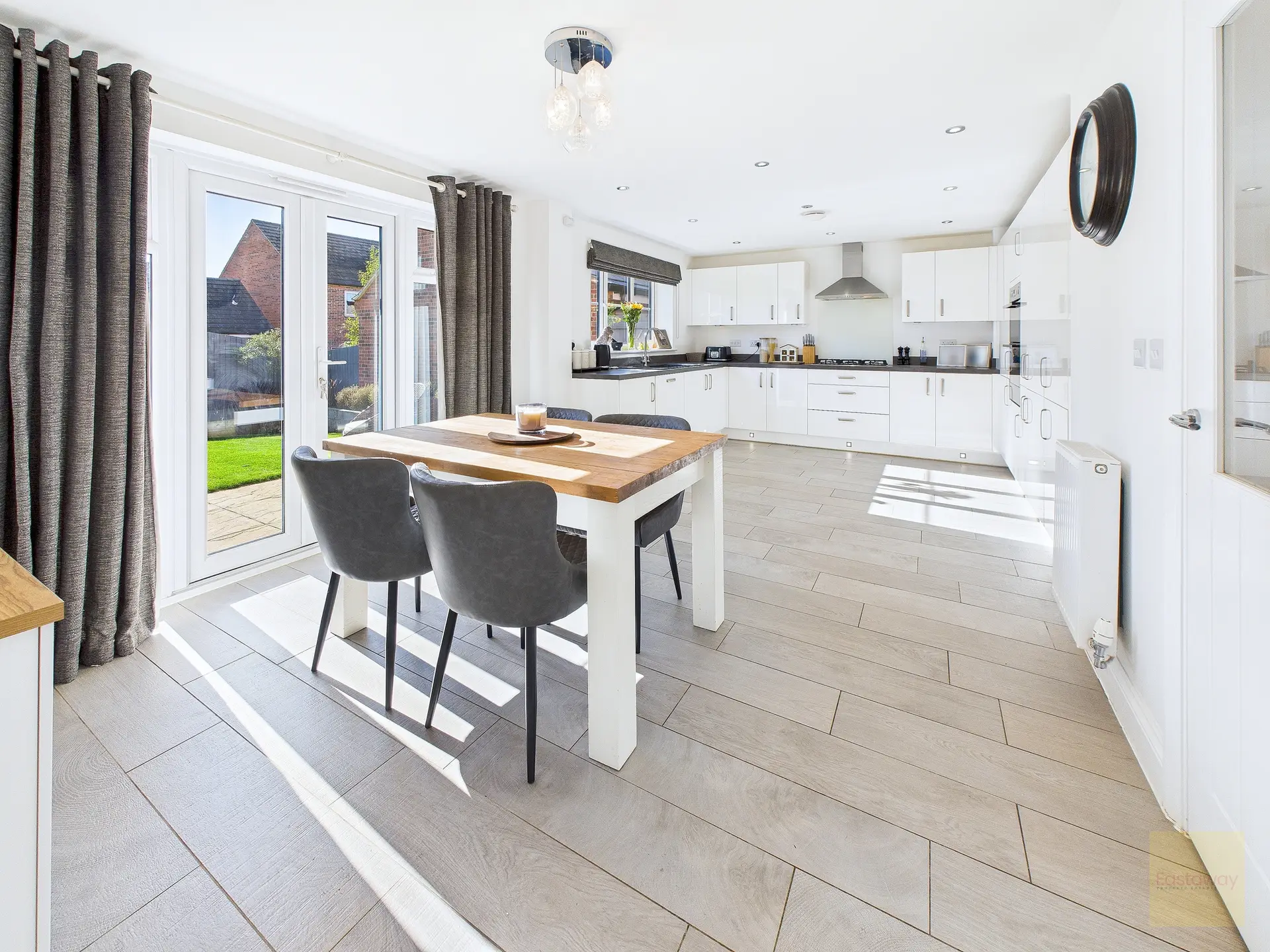 The kitchen diner is the real showpiece. Finished with sleek cabinetry and integrated appliances including oven, hob, fridge-freezer, dishwasher, and extractor, it’s as practical as it is stylish. There’s room for a full-size dining table, and with French doors opening directly into the garden, it’s easy to imagine hosting barbecues in summer or enjoying long Sunday lunches that flow between inside and out. The adjoining utility room gives you space to keep the noisy appliances tucked away, and a ground floor WC makes day-to-day life that bit simpler.