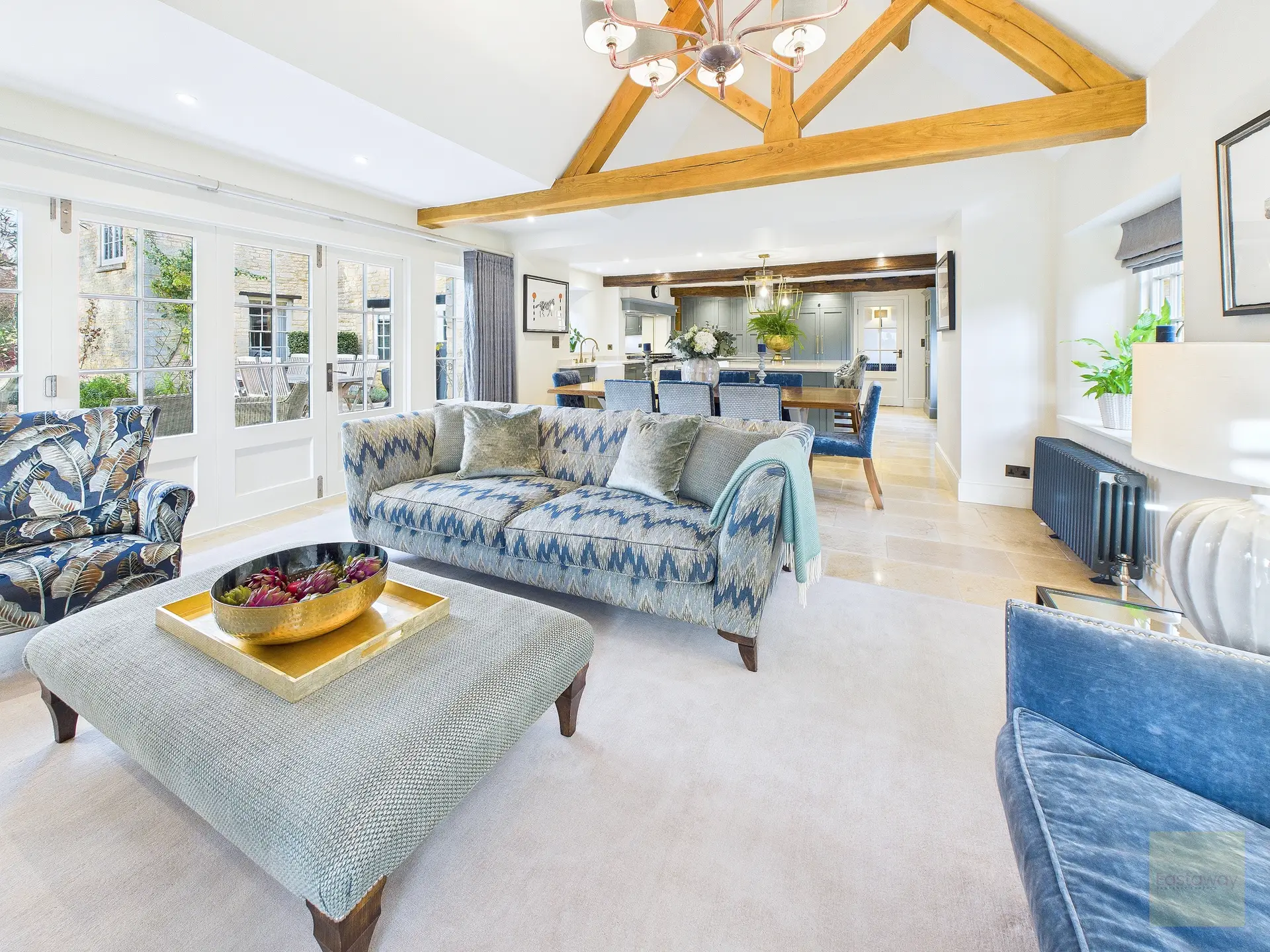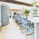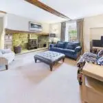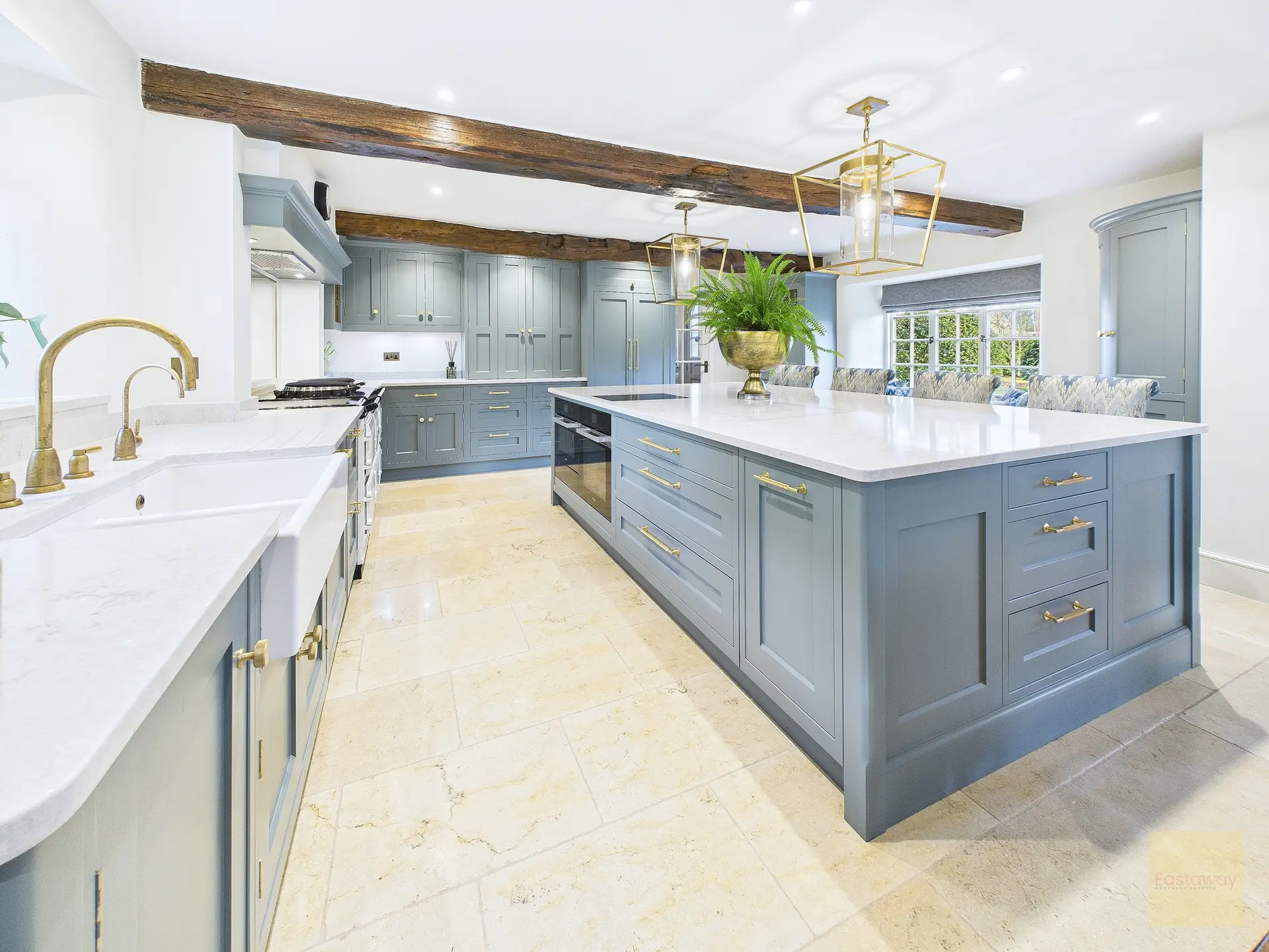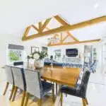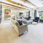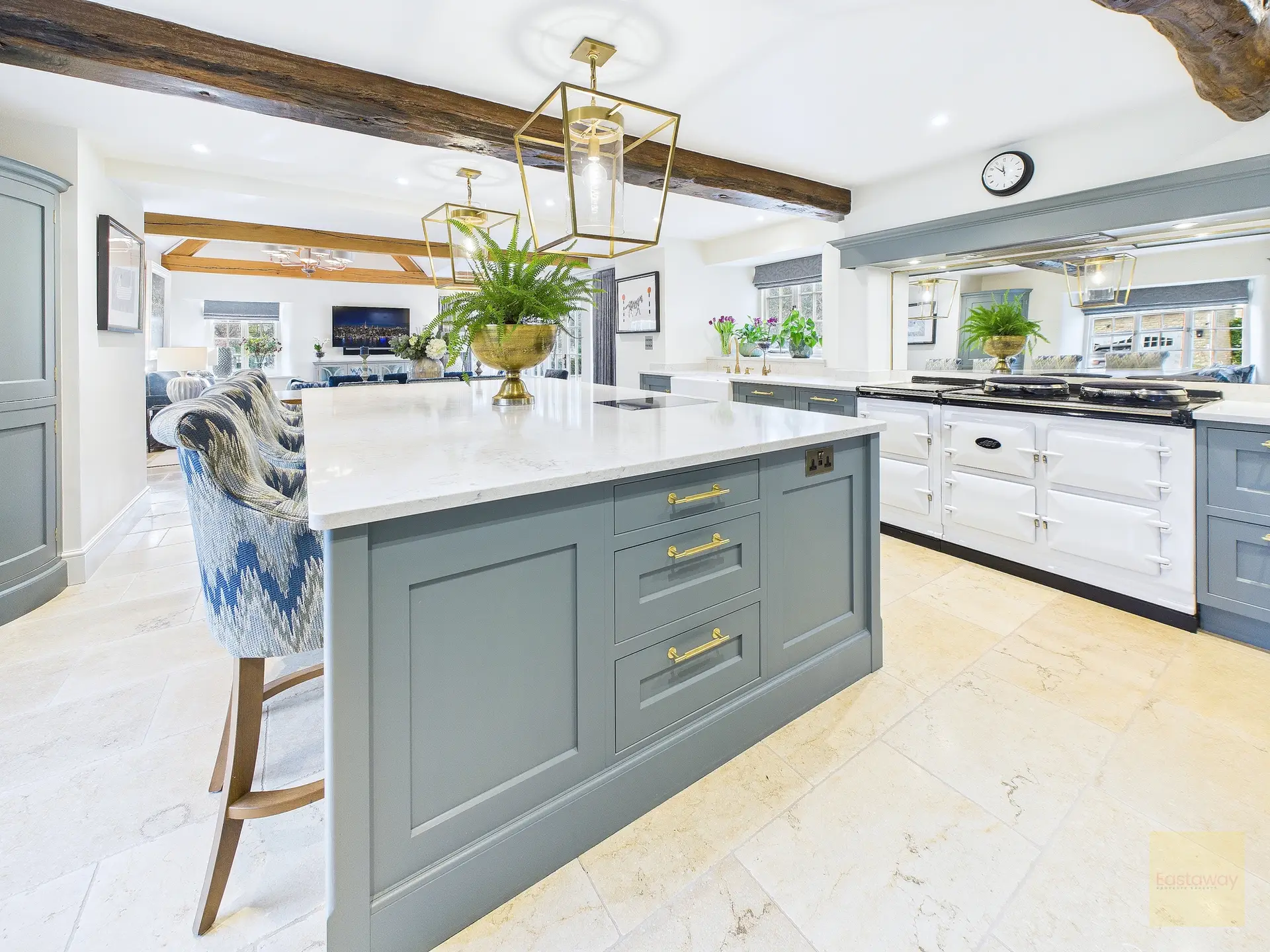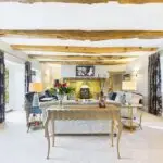 Inside, the atmosphere is warm and welcoming. Exposed beams, stripped back to their natural wood, run through the house. Light moves softly across limestone floors, oak hallways, and beautifully proportioned rooms. Nothing feels overdone. It all feels considered, calm, and effortlessly elegant.