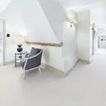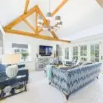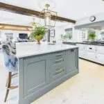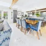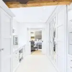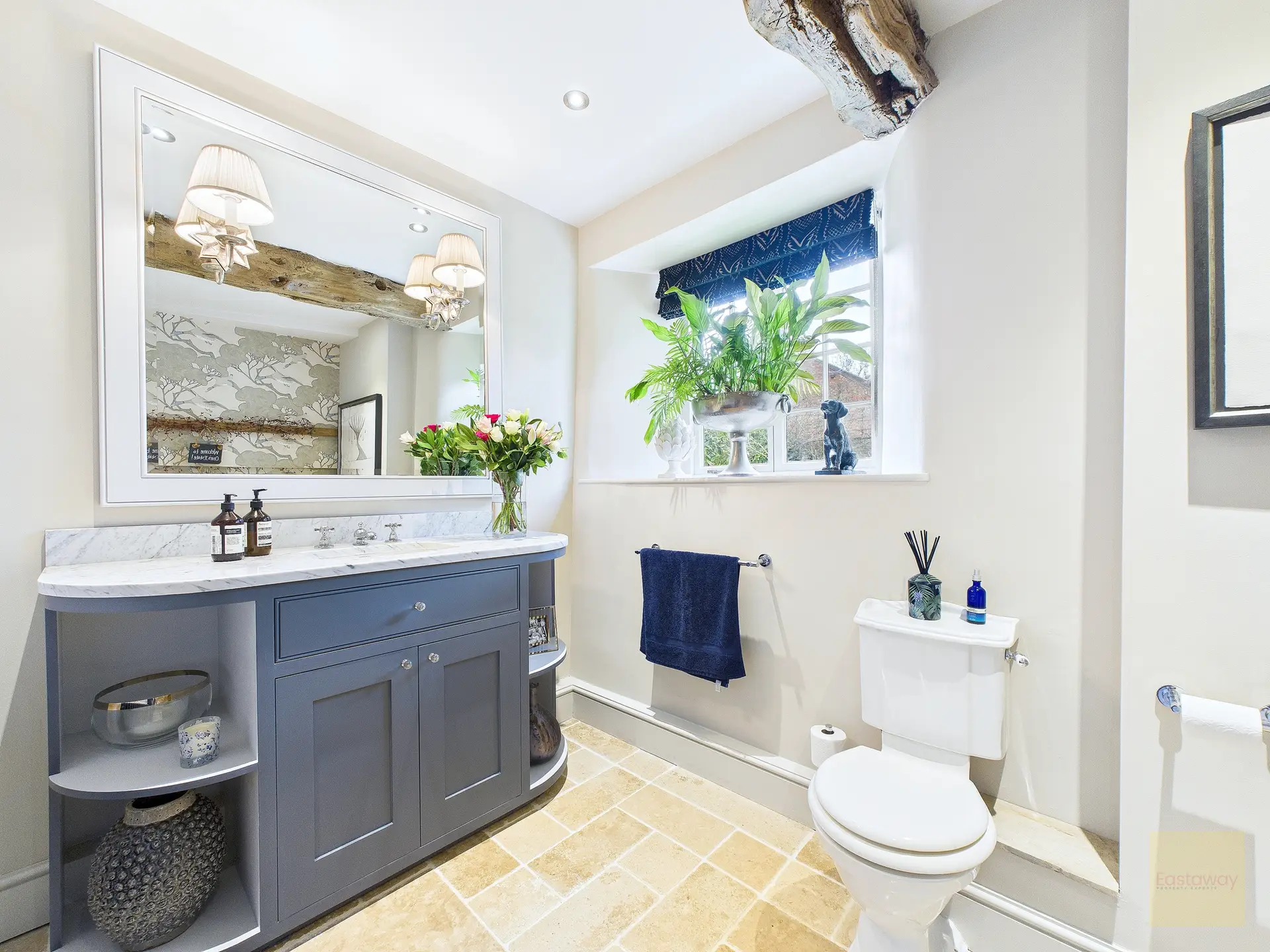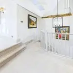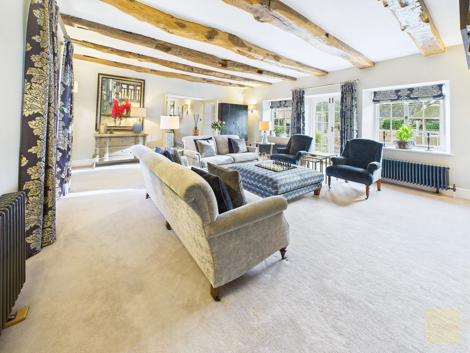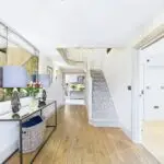 Inside, the atmosphere is warm and welcoming. Exposed beams, stripped back to their natural wood, run through the house. Light moves softly across limestone floors, oak hallways, and beautifully proportioned rooms. Nothing feels overdone. It all feels considered, calm, and effortlessly elegant.