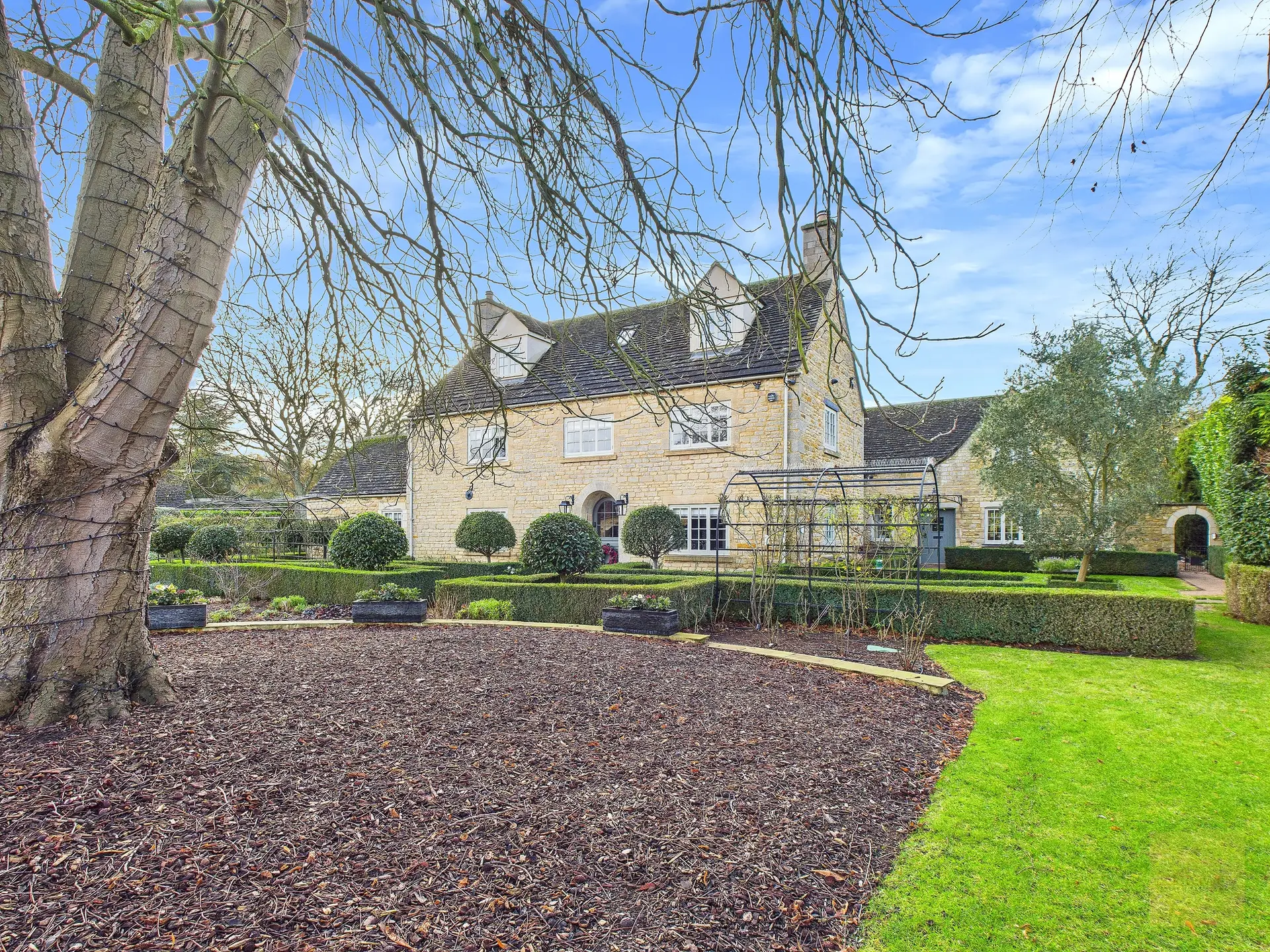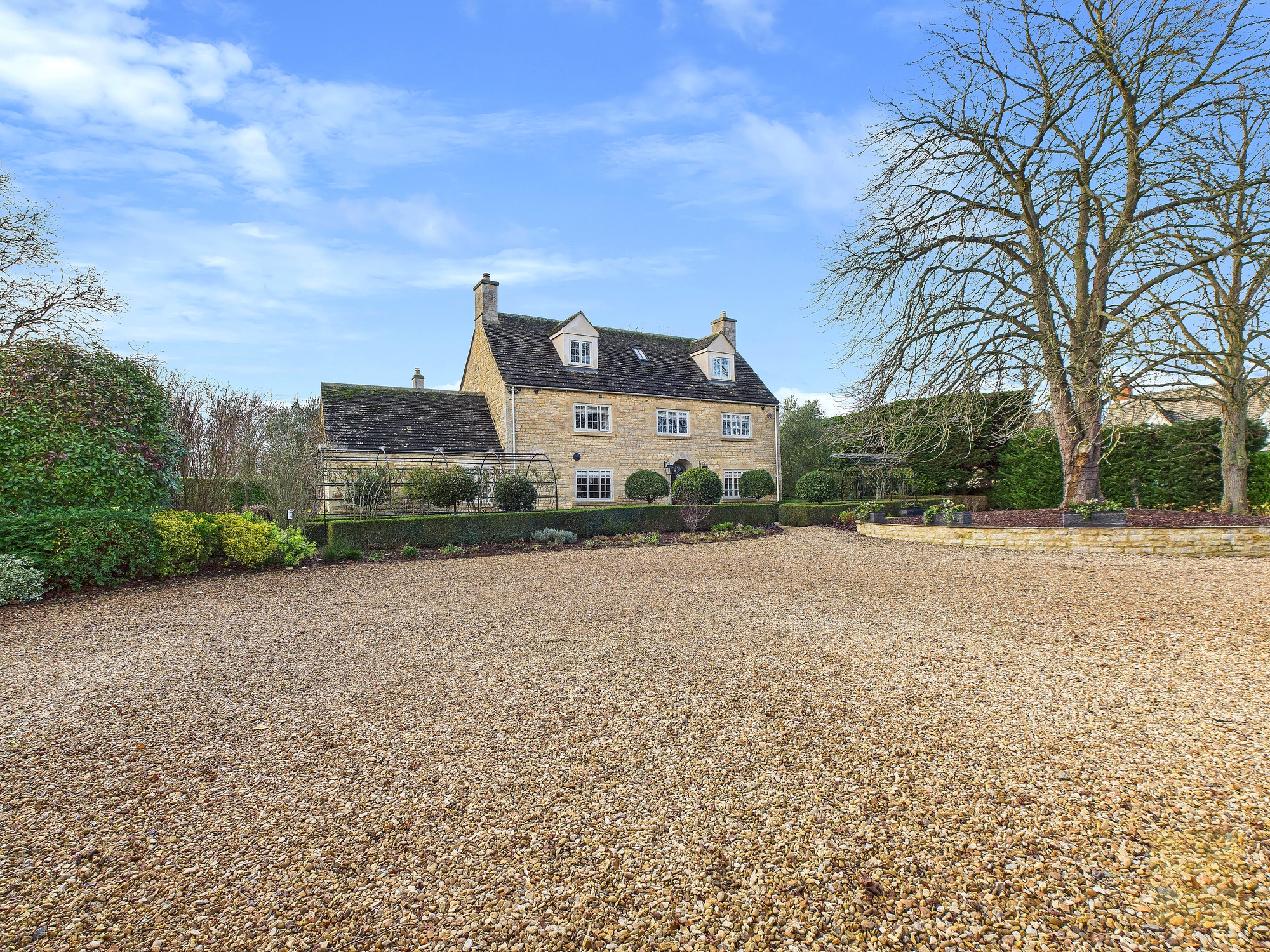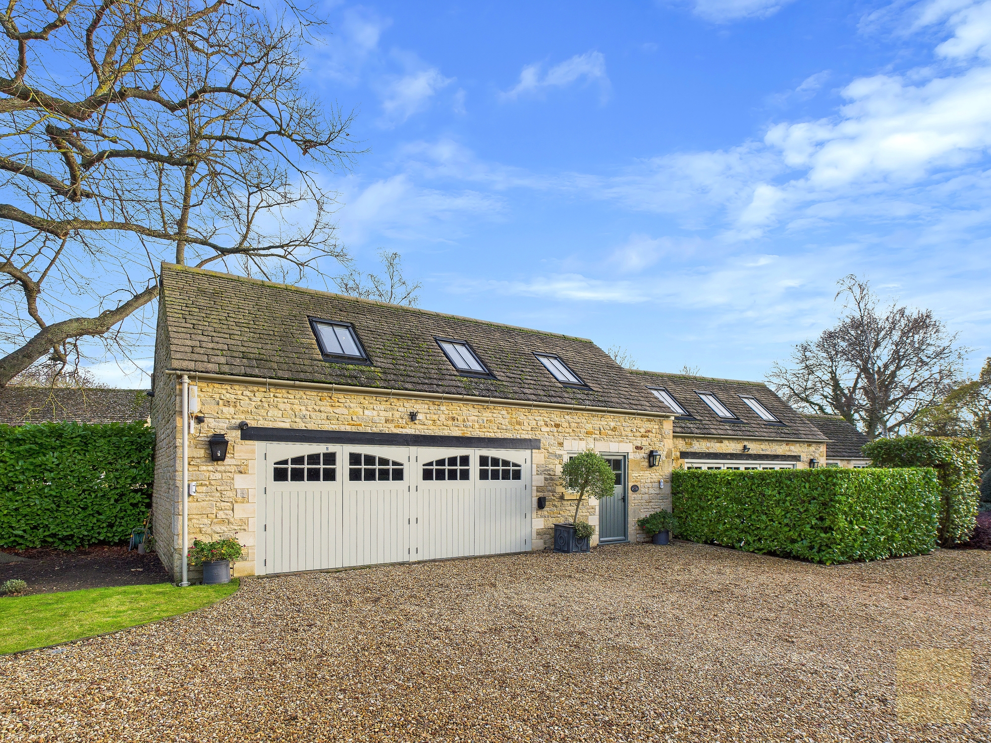 You arrive through electric wooden gates and immediately feel a sense of privacy and security. Stone walls wrap around the property, planting has been carefully designed to shield the house throughout most of the year, and the gravel driveway opens out in front of you with quiet assurance. This feels safe, settled, and discreet. The kind of place where your shoulders drop the moment you arrive home.