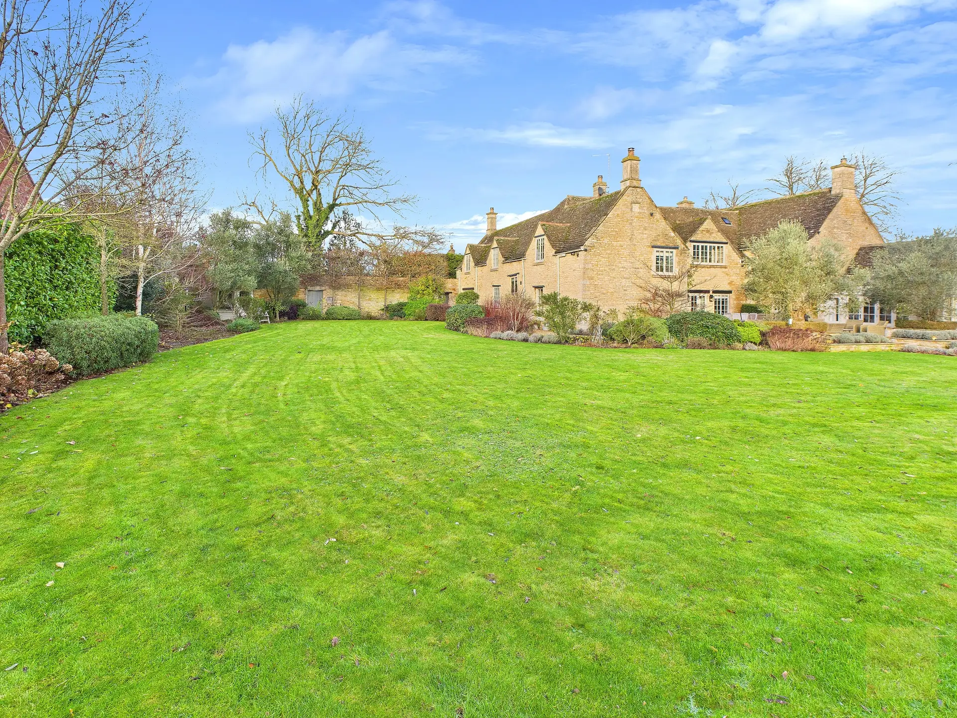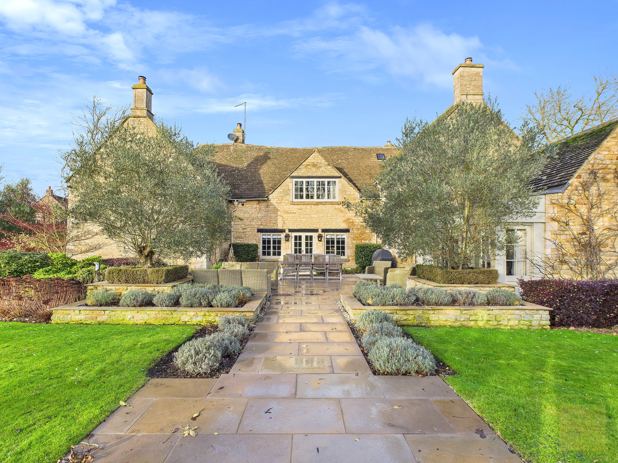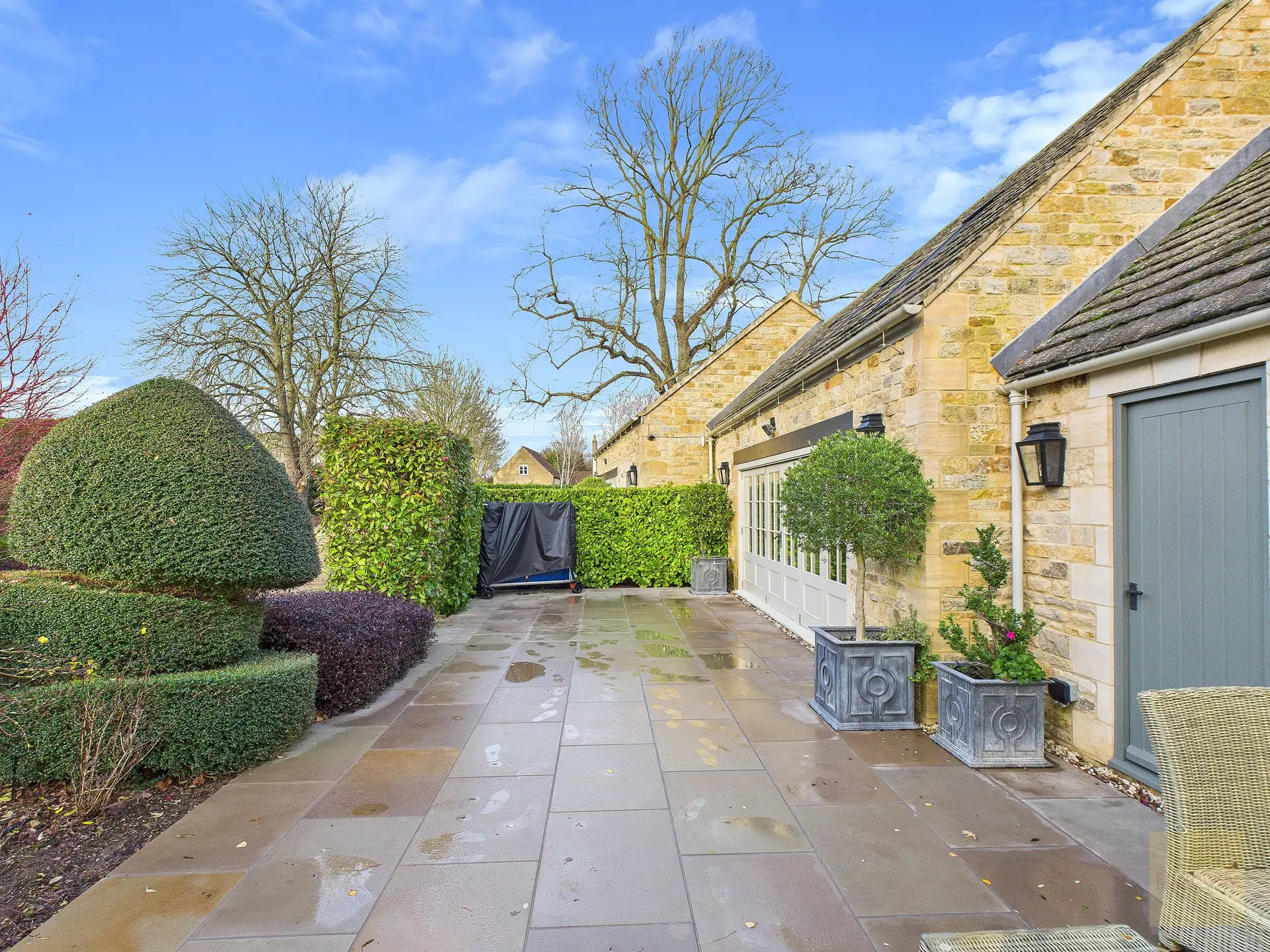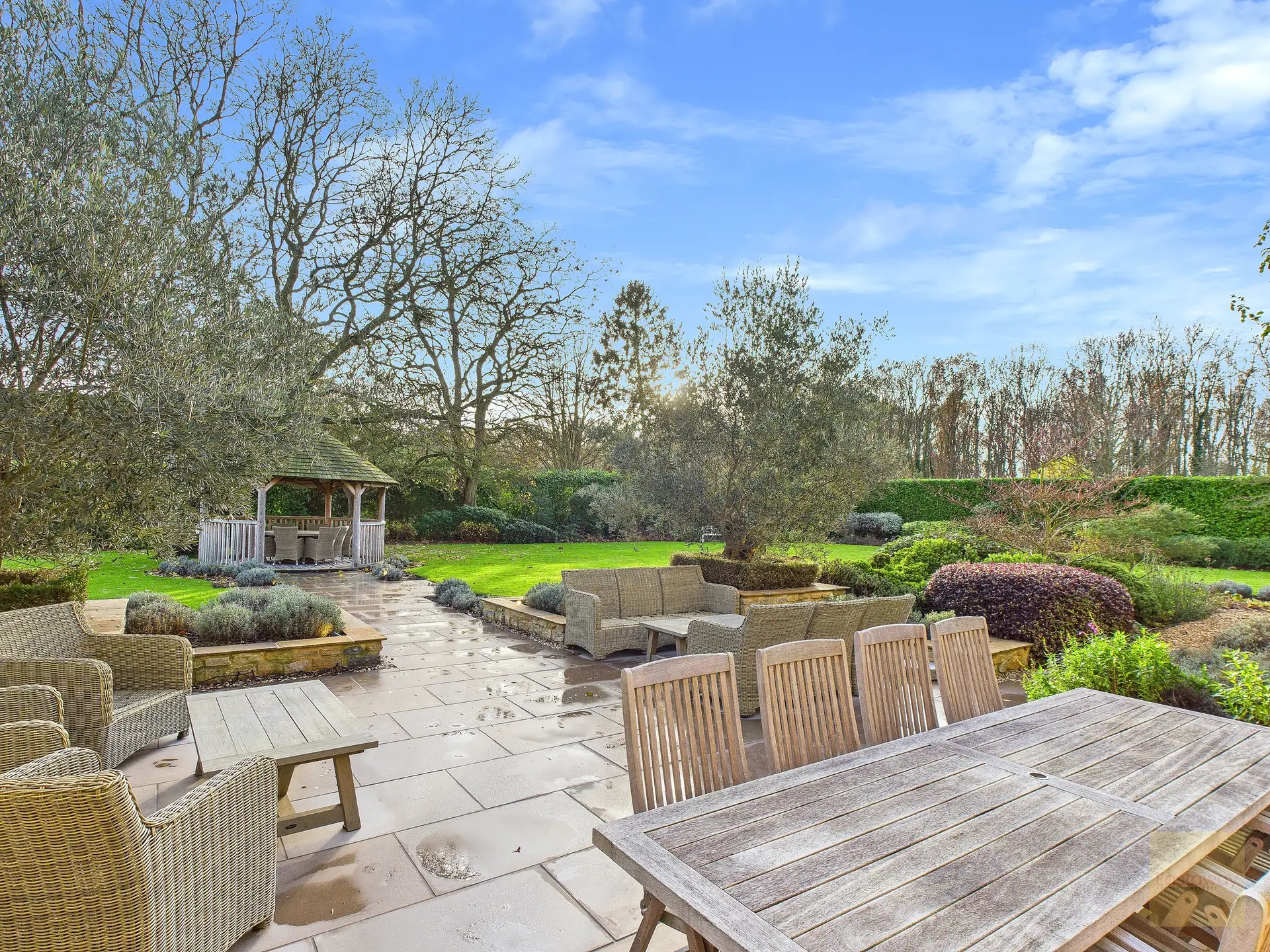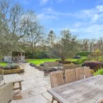 Outside, the gardens wrap around the property and feel as carefully considered as the house itself. Irrigation runs throughout the lawns, borders, and pots, while garden lighting highlights trees, pathways, and terraces as evening draws in. There are places to sit, to entertain, to pause, and to enjoy the sense of privacy the setting offers. The garden faces southwest, so light lingers well into the evening.