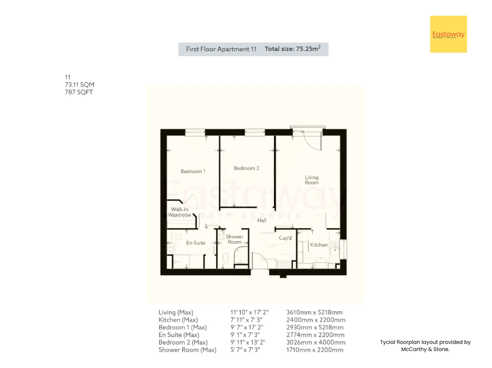 Floorplans and room dimensions are provided for guidance only. Measurements are maximum dimensions and layouts shown are typical designs provided by McCarthy & Stone. Individual apartments may vary.