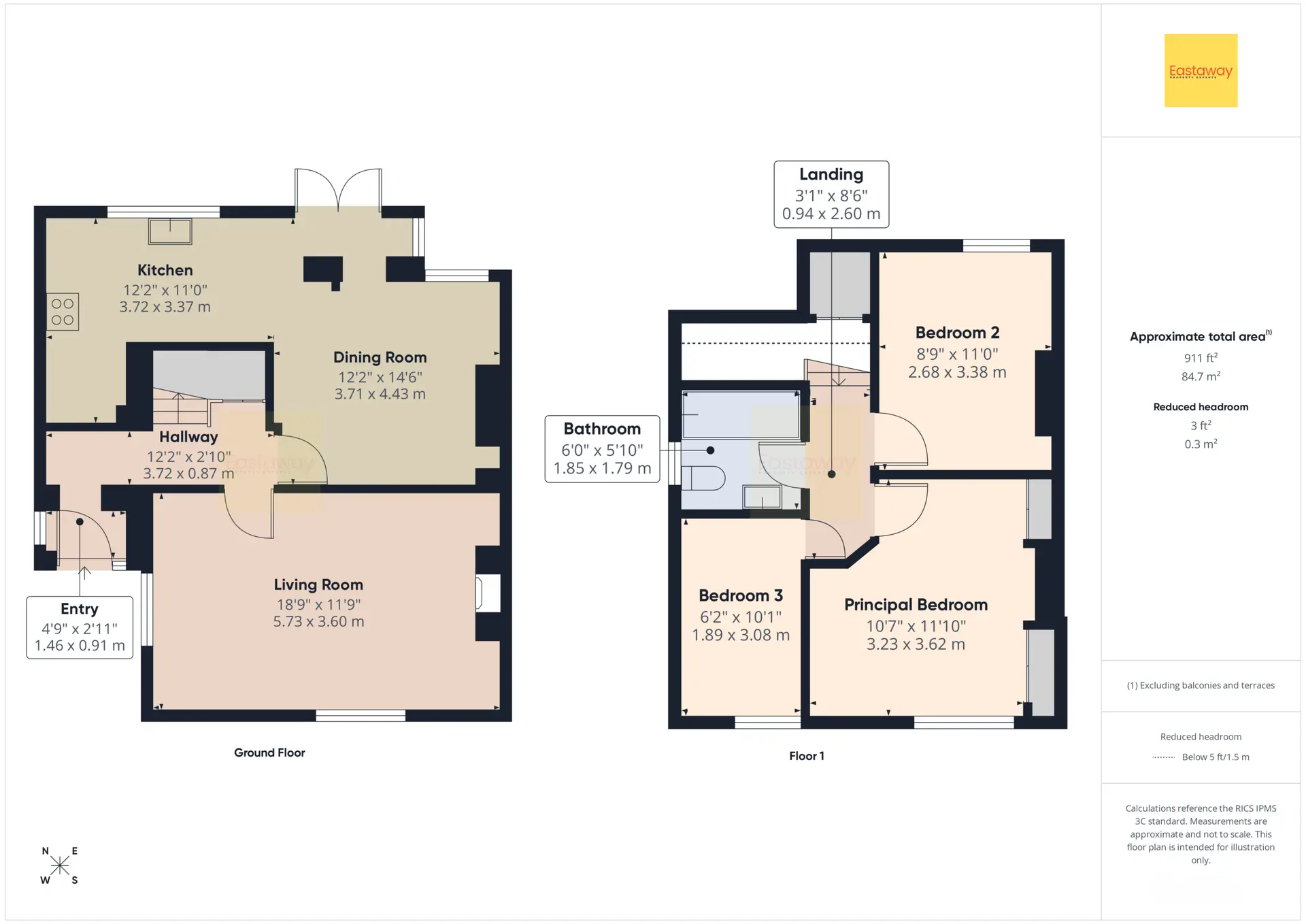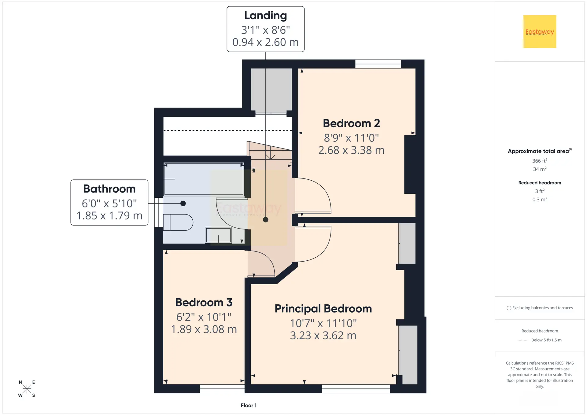Landing 3' 1" x 8' 6" (0.94m x 2.60m)